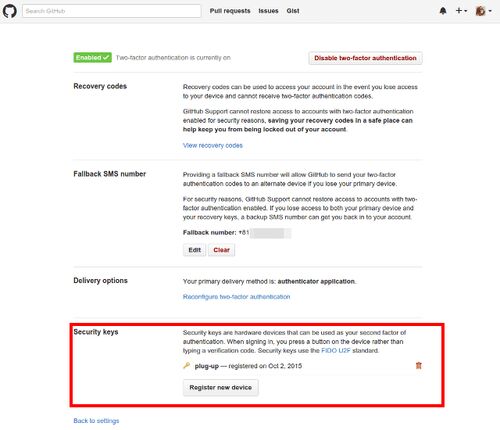 GitHub supports Universal 2nd Factor authentication · GitHub 先日、GitHubがFIDO U2F準拠のセキュリティキーに対応したので早速登録してみるなどした。といってもGitHubあまりつかってないけどね(GitHub Pages公開していたりGistをいくつか公開している…