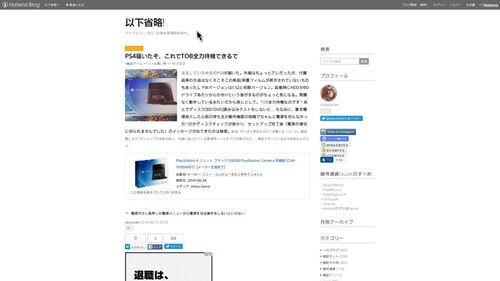 タイトルがまとめブログ調になっているが気にしないこと。PS4のインターネットブラウザでこのブログを見てみた時のスクショ。PS4標準のシェア機能を使うとスクショが撮れるので(同時にTwitterなどにも投稿できる)。 左右の余白が微妙に気になる感。ワイドデ…