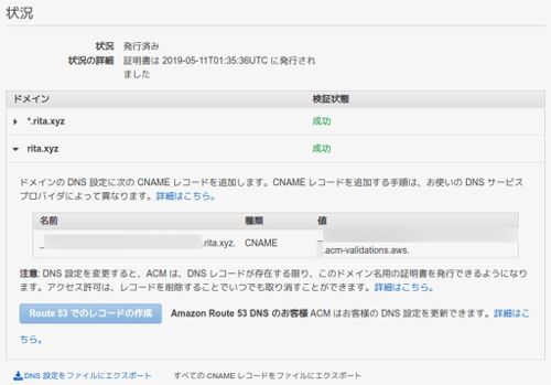 AWSから「ACMで取得したrita.xyzの証明書、このままだと自動更新されないよ、DNSでの認証に切り替えるか、ドメイン管理者宛に送ったメール確認してね」というメールが来ていたのでDNSでの認証に切り替えて再発行したのは秘密。メールによる認証で発行された…