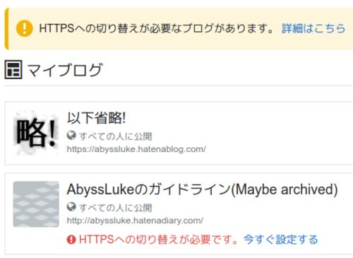 このブログはHTTPS配信だが、はてなダイアリーから移行した過去のブログ(更新停止)はHTTPS配信に移行していない。故に管理画面でHTTPSにしろと言われている(記事画像)。だが、あちらは更新停止故、Mixed Content対策が……(あと過去のカオスな記事云々)。なの…