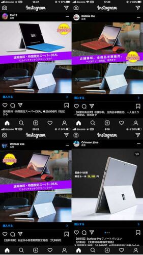 Instagram広告警察(自称)パトロールで見つけた詐欺広告の巻。偽Surfaceの広告、ひどい時に4-5回連続で流れてきたので適当に4つ晒してみる。恐らく適当に似せた中華タブレットの類をSurfaceと偽って売っているかもしれないし、全く違うものを送ってくるのかも…