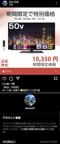 Instagram広告警察(自称)活動報告。記事画像は今日見かけた4Kテレビ激安販売の詐欺広告である。50V型で10350円という通常ではありえない価格。出稿者名として日本人名が出ているが、出稿者のアカウント名を見てみるとピンインっぽい匂いが。アカウント作成日…