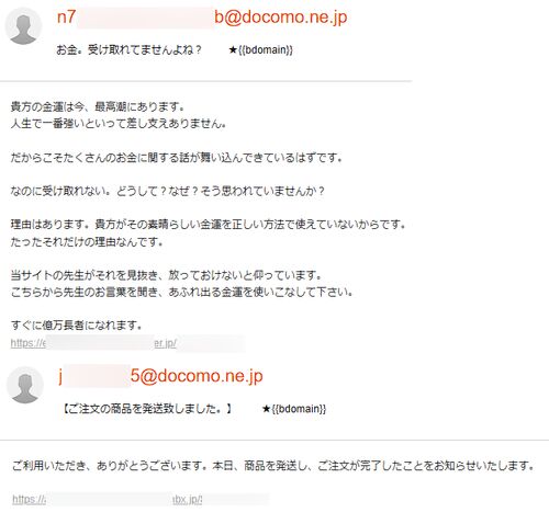 ここ最近、auの携帯キャリアメール宛にドコモなドメイン(docomo.ne.jp)なspam(例は記事画像参照)が多くなってきたような(Fromをなりすましているならフィルタ側で弾くのでドコモメールからの発信で間違いない)。ちょっとうざいのでドコモからのメールを一括…