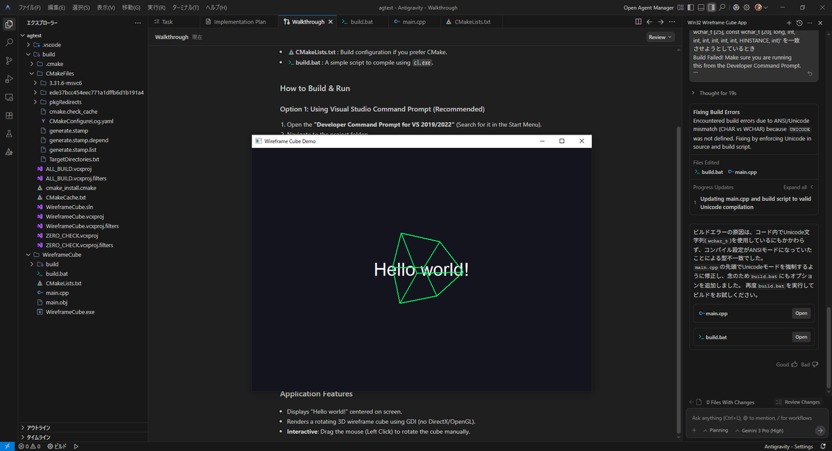 GoogleのGemini 3 Proなどを使ってバイブコーディングできるVSCodeのフォーク版 Antigravityを入れて、試しにHello world!の表示&立方体が回転するだけ*1のWindowsネイティブなアプリを作ってみたのは秘密。Visual Studio Build Toolsを入れてあるので別途コマンドプロンプトでビルドコマンドを叩くだけでビルドできた*2。モデルはGemini 3 Proの他にClaude Sonnet/Opus 4.5、GPT-OSS 120Bを使うことも可能。Google AI Pro登録でエージェントの制限回数が緩くなる。今後いろいろ試してみるかなぁ。