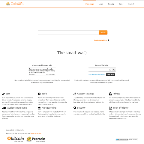 短縮URLでBTCが得られるCoinURLというサービスに登録してみるなど。短縮URLを開くとリンク先にリダイレクトする前に広告が表示され広告の報酬がユーザーに入る*1という仕掛け。APIが用意されていたり、ページ上のリンクをCoinURL経由にさせるスクリプトもあったりする。短縮URLの他、サイトにバナー広告の掲載も可能(レンタルブログ(Bloggerなど)やwix、無料ホスティングサービス上にあるサイトへの掲載は不可)。出金は0.15BTC/月未満の場合は1%の手数料が取られる(昔は12%だった)。とりあえず短縮URLの例:(削除)(ジャンプ先はMoon Bitcoin) ※2022/06/19 リンク削除