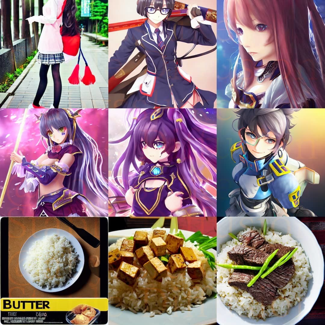 画像生成AIの一種であるStable Diffusionが無料公開されたので、Google Colaboratory(以下Colab)で動かす手順(GIGAZINEとかにある)を参考に遊びまくっている。記事画像が生成した画像の例。いろいろなpromptを試して良さげなイラストが作れるか試行錯誤したり。あとは食べ物系の画像を作ってみる芸も。記事画像下の3枚は"~ on the rice"のpromptで生成したものであり、左側"butter"はご飯の画像の下にBUTTERの文字と謎の料理が出ている謎構図になり、中央の"tofu"だとご飯の上の豆腐が乗って野菜が添えられているいわゆる豆腐丼(マーボー丼の汁無し版?)、右側"beef"はステーキ丼ができあがっている。なお、生成しまくった結果ColabのGPUランタイム無料利用上限をオーバーしてしまい一時的に制限された模様。Colab Proにアップグレードしたらどのくらいまで生成できるんだろうねぇ。