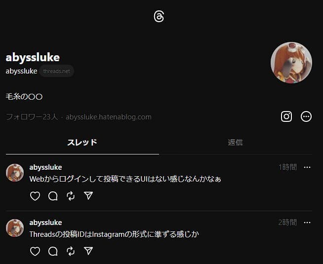 昨日Threadsが6日23時にリリースされると書いたが、iOSアプリが5日23時にフライングリリースされ*1、その後オープン日時が6日8時に前倒しされたと思ったら8時前に利用登録できるようになった件。というわけで登録。https://www.threads.net/@abyssluke。Instagramからアイコン・プロフ・フォローを引き継げるのは強い。ActivityPub(Fediverse)にも対応予定と。一応登録順に番号が振られるらしく、自分は19235番目らしい(Instagramのプロフィールページで確認できるが非表示にもできる)。まぁTwitter/Misskey/nostr/Bluesky/Threadsと並行して読み書きするのはいろいろとアレなので用途ははっきりさせておくべきか。ただThreadsはWeb向けのUIが閲覧のみだからのう……