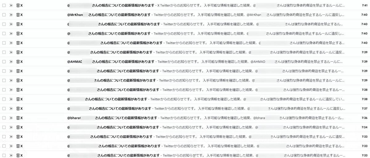 Twitter(𝕏)の報告システム周りの仕様変更があったのか、今日朝から「(screen_name)さんの報告についての最新情報があります」のメール爆撃が来るようになった件。インプレゾンビやアレな輩に対し「暴力の賛美」「暴力の扇動」等で報告したものに対する「それってあなたの感想ですよね?」(意訳)で、「入手可能な情報を確認した結果、(screen_name)さんは強烈な身体的脅迫を禁止するルールに違反していないと自動化システムによって判断されました。」と若干内容が異なる。そこそこな量を報告している自分は1分間に約2-3通の爆撃を受けており、メール通知も毎回飛びまくっているのでゴミ箱直行とした。執筆時点現在も爆撃を受けているがゴミ箱に行くので通知は飛ばない。